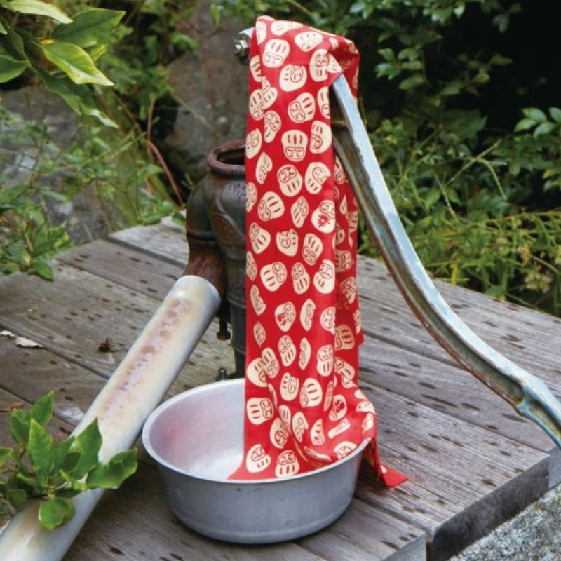 Ta czerwona japońska ściereczka tenugui z nadrukiem Daruma będzie świetnie wyglądać w kuchni lub łazience. Jego bawełniana tkanina jest idealna do wycierania rąk lub twarzy. Daruma to japoński amulet szczęścia, symbol sukcesu i wytrwałości.