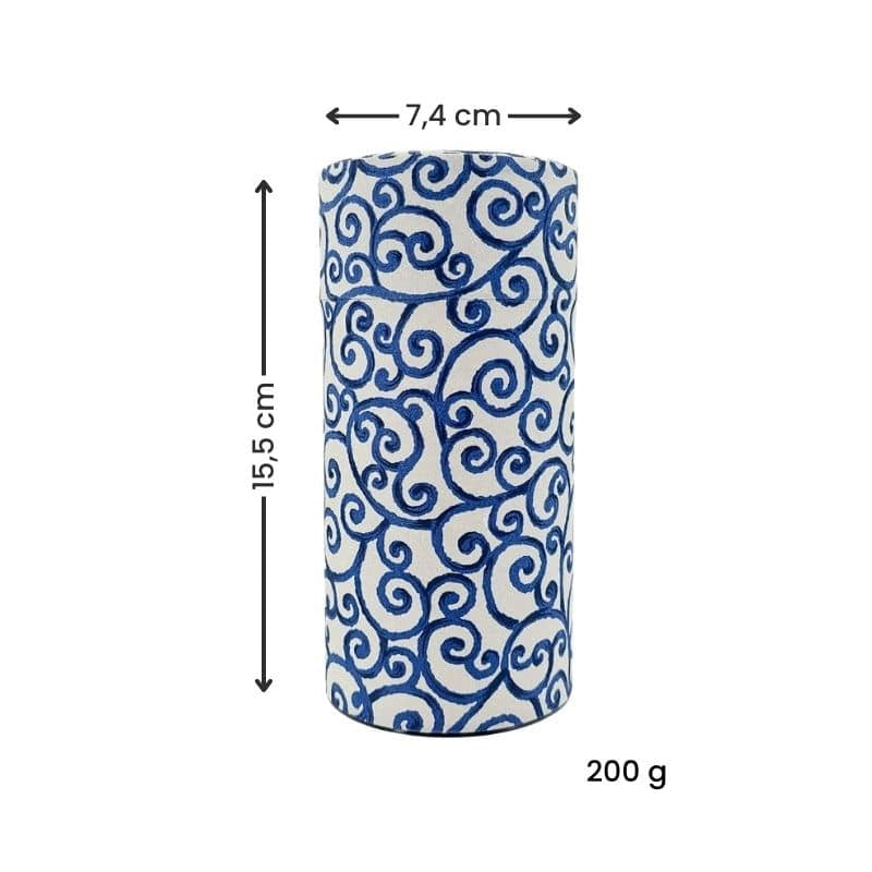Ręcznie malowany na papierze washi, ten ładny pojemnik na herbatę jest pokryty motywem karakusa. Ten tradycyjny japoński motyw przedstawia rosnącą roślinę, symbol dobrobytu i długowieczności.