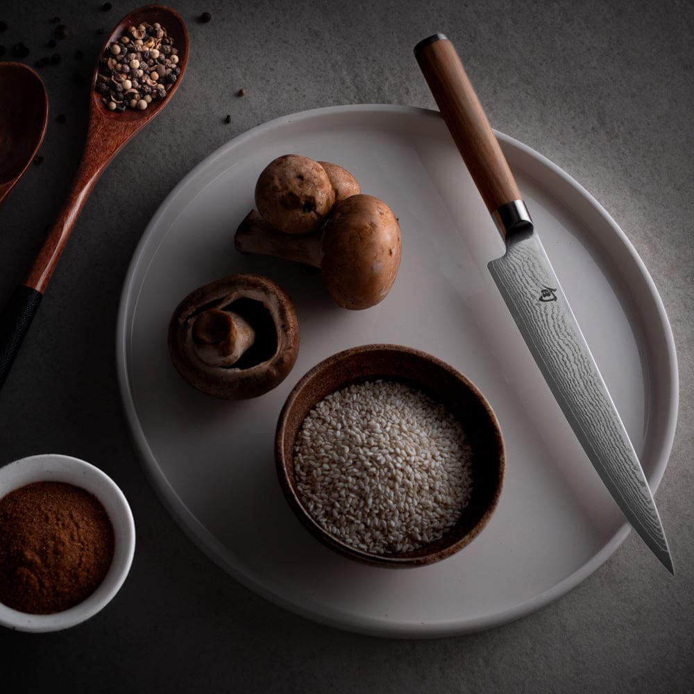 W Twoich rękach staje się niemal instynktowny. Uniwersalny nóż Shun Classic White 15 cm nie tylko tnie: ślizga się, kroi i wzmacnia gesty. Jego wyrafinowany design, z lekką rękojeścią z drewna pakka i ostrzem z adamaszku, przywołuje japońską estetykę w całej jej czystości. To idealny towarzysz do wszystkich małych, precyzyjnych zadań: siekania świeżych ziół, krojenia soczystych owoców lub krojenia świeżej mozzarelli. Lekki, poręczny i ostry jak brzytwa, jest równie piękny, co niezwykle wydajny. Piękny przedmiot do wyeksponowania w kuchni... lub do podarowania w prezencie miłośnikowi ostrych noży.