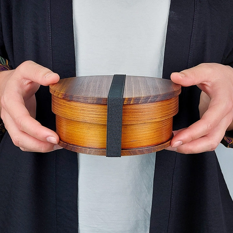 Okrągły japoński pojemnik na lunch b ento z wyjmowaną przegrodą jest idealny do przechowywania kompletnego i zbilansowanego posiłku. Wykonane ręcznie w Japonii, wykonane jest z drewna cedrowego i pokryte naturalnym lakierem. W zestawie znajduje się elastyczna opaska do zamykania. Świetny pomysł na prezent dla fanów japońskiej kuchni.