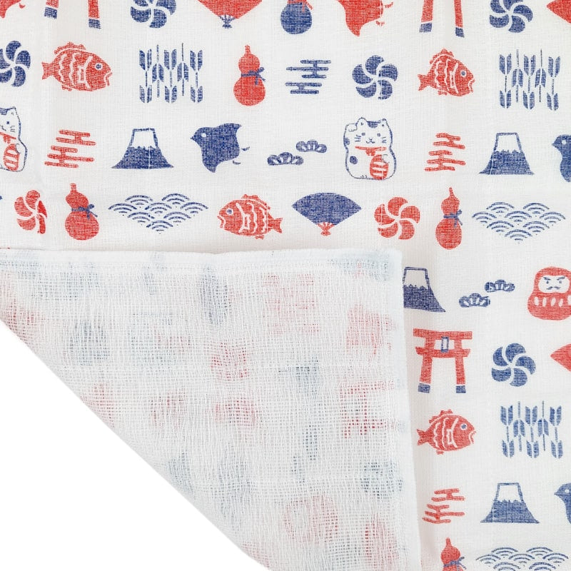 Fukin, czyli japoński ręcznik do herbaty, charakteryzuje się moskitierą wykonaną z mieszanki bawełny i sztucznego jedwabiu oraz wysoką chłonnością. Do codziennego użytku obejmują ręczniki do rąk, ściereczki do naczyń, podkładki i maty do odsączania. Trwałe, niestrzępiące się i szybkoschnące. Wzór na tym japońskim ręczniku zawiera japońskie symbole szczęścia, takie jak maneki neko, daruma i karp koi.
