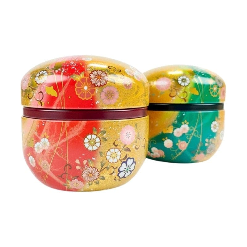 Okrągły japoński pojemnik na herbatę ze złotego i czerwonego metalu
